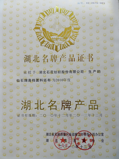 “Xianshi” brand fabrics are awarded “Customer-recognized Commodity” by Hubei Provincial Industrial and Commercial Bureau |