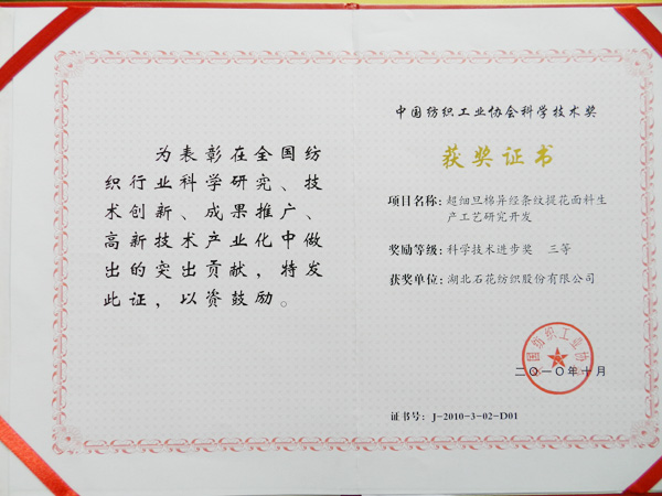 | Hubei Province Renown Product | “Super-fine jacquard fabrics with varying warps” wins Hubei Province Award for Science and Technology Advance and Innovation | |